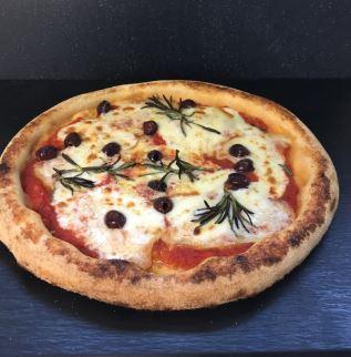 BASE TOMATE, MOZZARELLA FIOR DI LATTE, JAMBON SERRANO, FROMAGE RODEZ TOSCANELLO, OLIVES NOIRES, TOMATES CERISES ET AIL FRAIS MARINÉS À L’HUILE D’OLIVE